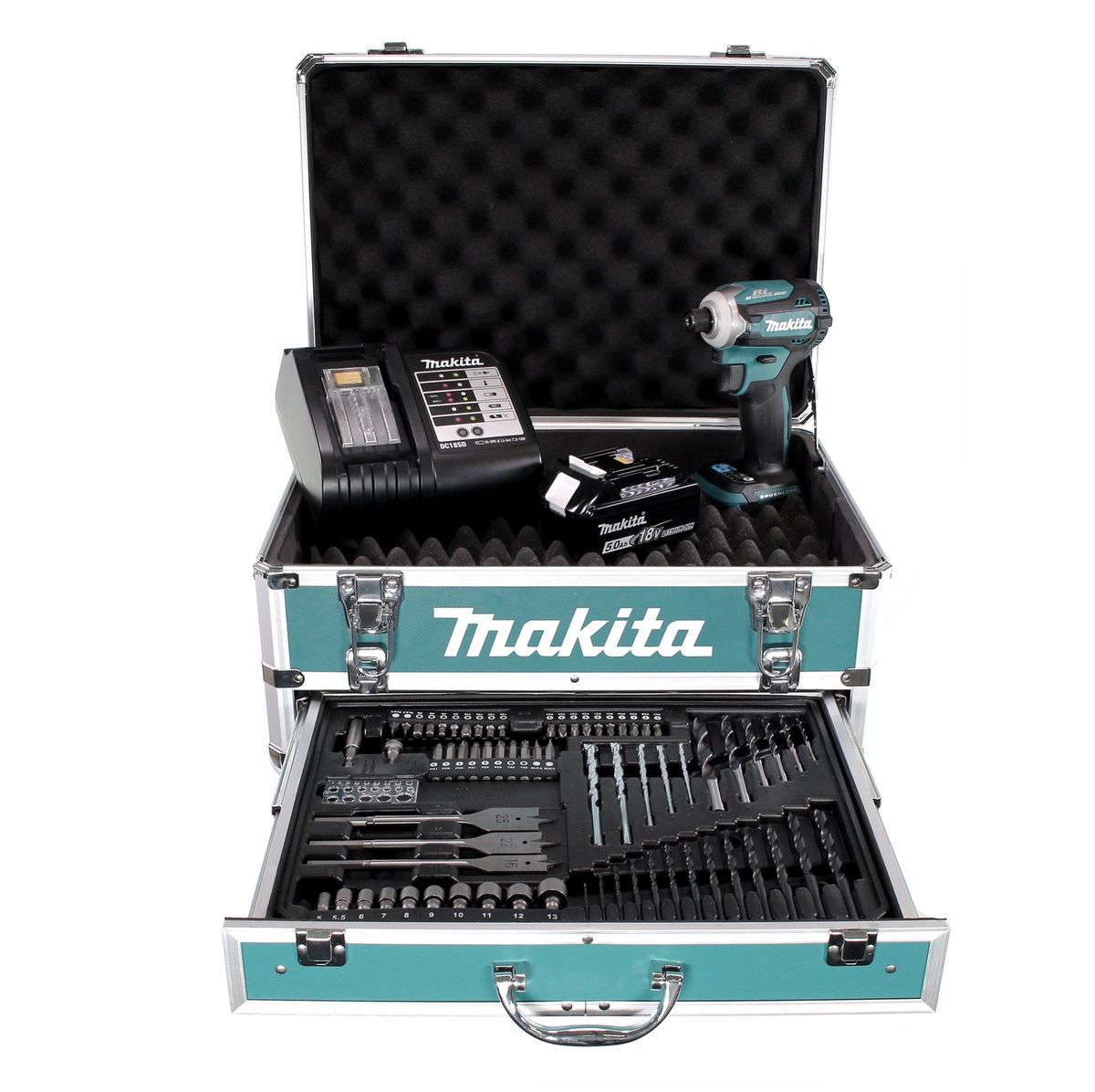 Der Akku-Schlagschrauber DTD 171 ist das neue Spitzenmodell aus der Makita DTD-Reihe. Der bürstenlose 18 Volt-Motor sorgt für viel Ausdauer, einen hohen Wirkungsgrad und verschleißfreie Arbeit. Die Maschine sorgt durch Ihre kompakte Bauweise für ein optimales Handling. Sie bietet vier Gänge sowie vier intelligente Unterstützungsmodi. In den vier regulären Gängen steigen mit jeder Stufe die Dreh- sowie Schlagzahl an. Im Holzmodus läuft die Maschine mit geringer Drehzahl an, bis die Schraube greift und dadurch der Widerstand steigt. Dann steigert der Schlagschrauber die Umdrehungen. Im Lösemodus unterstützt er Schlagschrauber das Herausdrehen, indem er die Schraube, Mutter o.ä. mit viel Kraft löst, danach aber die Drehzahl verringert – so fällt nichts herunter und das Material wird geschont. Der Tech-Mode 1 sowie der Tech-Mode 2 erleichtern das Verschrauben mit Bohrspitze in feste Materialien wie Metall. Sobald die Schraube greift und das Schlagwerk einsetzt, wird die Drehzahl verringert. Dabei ist der erste T-Modus für dünne Metallplatten und der zweite T-Modus für dicke Metallplatten geeignet. Praktischerweise ist die Modusauswahl mit nur einer Hand möglich, sodass maximale Flexibilität gegeben ist. Durch die starke Werkzeugaufnahme wird zudem das Verwackeln des Bits reduziert. Die beiden eingebauten LEDs rechts und links am Gehäuse sorgen für eine optimale Ausleuchtung des Arbeitsbereichs, ohne lästige Schatten zu werfen, wie dies manchmal bei nur einer LED der Fall ist. Durch das in der Schublade vorhandene 70 teilige Bit und Bohrer Set sind sämtliche Anwendungen abgedeckt. Es sind Bits, Fräser, Steckschlüssel und Bohrer in vielen Varianten vorhanden. Ob Holz, Metall oder Stein der Koffer beinhaltet eine Vielzahl an Bohrern in den gängigsten Größen. Die massive Verarbeitung des Koffers verspricht eine lange Lebensdauer und ist zudem auch echt schön anzusehen. Der gummierte Tragegriff ist schonend für die Handinnenflächen und kann auch problemlos mit Handschuhen genutzt werden. Die Metallschließen des Koffers sind robust und langlebig. Der Noppenschaum im Boden und im Deckel gewährleisten einen sicheren Transport der im Koffer befindenden Maschinen. Durch den Aluminium Koffer von Makita hat man das Arbeitswerkzeug und das entsprechende Zubehör in einem Koffer und sicher gelagert.