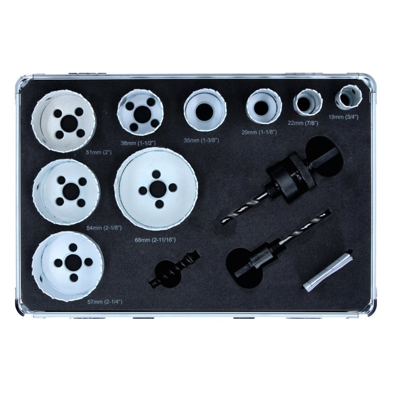 Die Makita Lochsägen sind aus Bi-Metall HSS gefertigt. Somit ist eine hohe Widerstandsfähigkeit und Langlebigkeit gegeben. Mit den neun Lochsägen 19, 22, 29, 35, 38, 51, 54, 57 und 68 mm lassen sich verschiedenste Materialien wie Stahl, Aluminium, Kupfer, Messing, Holz und Kunststoff bearbeiten. Die Lochsägen lassen sich dank des Adapters schnell und einfach wechseln. Das Set ist für alle Akku- und Netzbohrschrauber, Dreh- Schlagbohrer und Bohrhämmer geeignet.