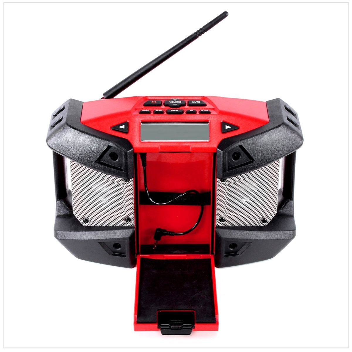 Das M12 JSR-0 Akku Baustellen Radio von Milwaukee überzeugt durch hohe Klangqualität und ein robustes Gehäuse. Die überzeugende Haltbarkeit von Milwaukee schützt die internen Komponenten des Radios mit einem ABS-Kunststoff und Stahl-Konstruktion. Der Betrieb des Radios erfolgt über 12 V Red Li -Ion Akkus oder mit 230 V Wechselspannung. Ausgestattet ist das Gerät mit einem Digitaltuner mit 10 Speicherplätzen. Des Weiteren verfügt das Radio über ein AUX-Kabel, das in einem geschütztem Fach für die sichere Lagerung von MP3-Player untergebracht ist.