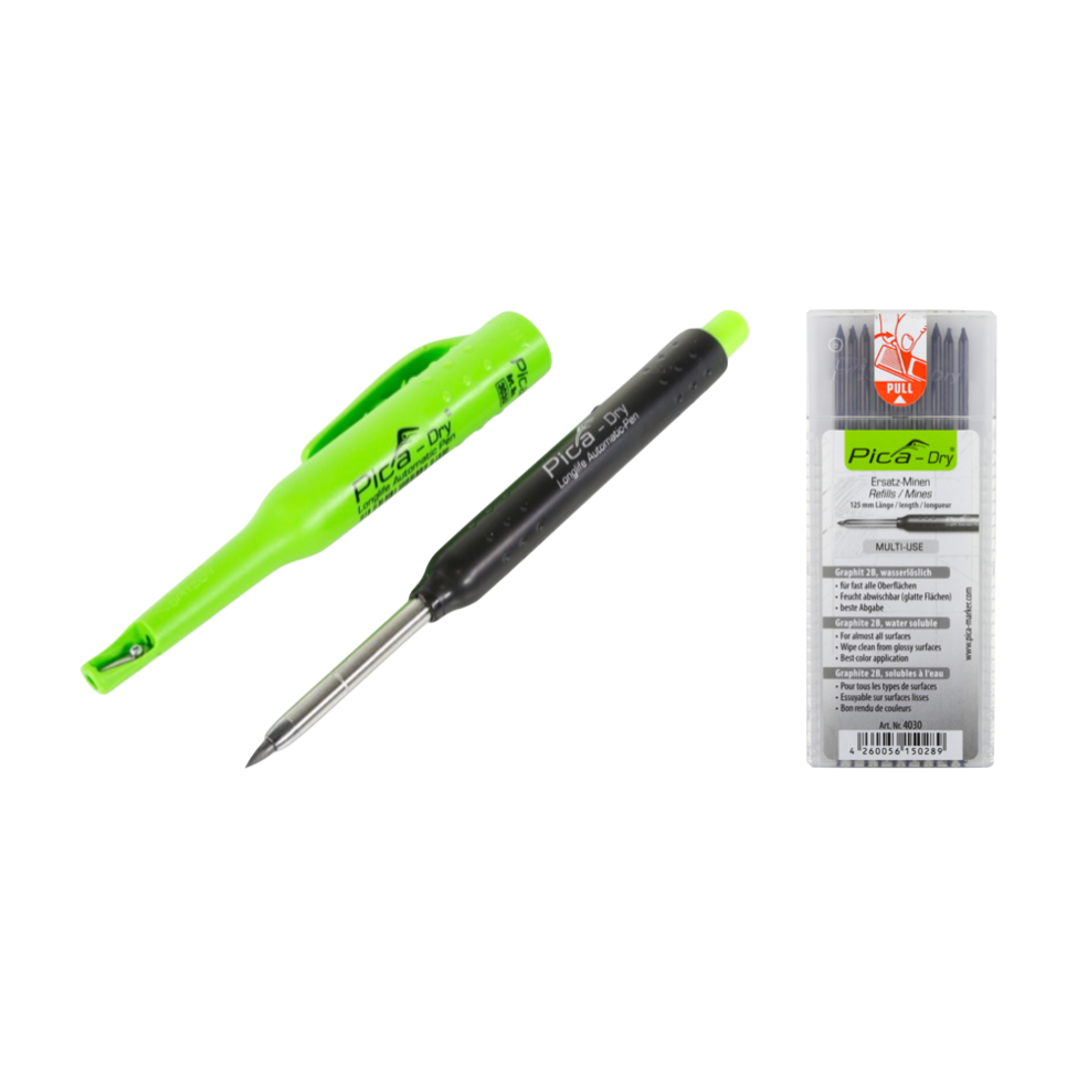Der Pica DRY Longlife Automatic Pen ist ein professioneller Handwerker Baumarker und ist mit einer speziellen FOR ALL Graphitmine 2B ausgestattet, welche Markierungen auf fast allen Oberflächen egal ob glatt oder rau, trocken oder feucht, staubig oder ölig ermöglicht. Zusätzlich sind Ihre Markierungen auf glatten Flächen sogar wieder feucht abwischbar und der Tieflochmarker ist mit verbessertem Staub- und Nässeschutz versehen. Der praktische Köcherschoner verfügt über einen Spezial-Clip für das einhändige Arbeiten und ist mit dem patentierten, integrierten Spitzer versehen. Die hochwertige Druckmechanik sichert einen automatischen Minenvorschub im Edelstahlrohr und die Minen sind dadurch höchst einfach von hinten nachfüllbar. Der Pica DRY Automatic Pen ist extrem langlebig und nachhaltig dank hochwertiger Produkttechnik und Nachfüllbarkeit und bietet vielfältigste Einsatzmöglichkeiten dank spezieller farbiger Ersatz-Minen: für helle oder dunkle Oberflächen, sowohl in wasserlöslich oder auch in wasserfest. Mit den 10 mitgelieferten wasserlöslichen Graphit-Ersatzminen sind Sie langfristig ausgestattet und können den Stift enorm lange nutzen.
