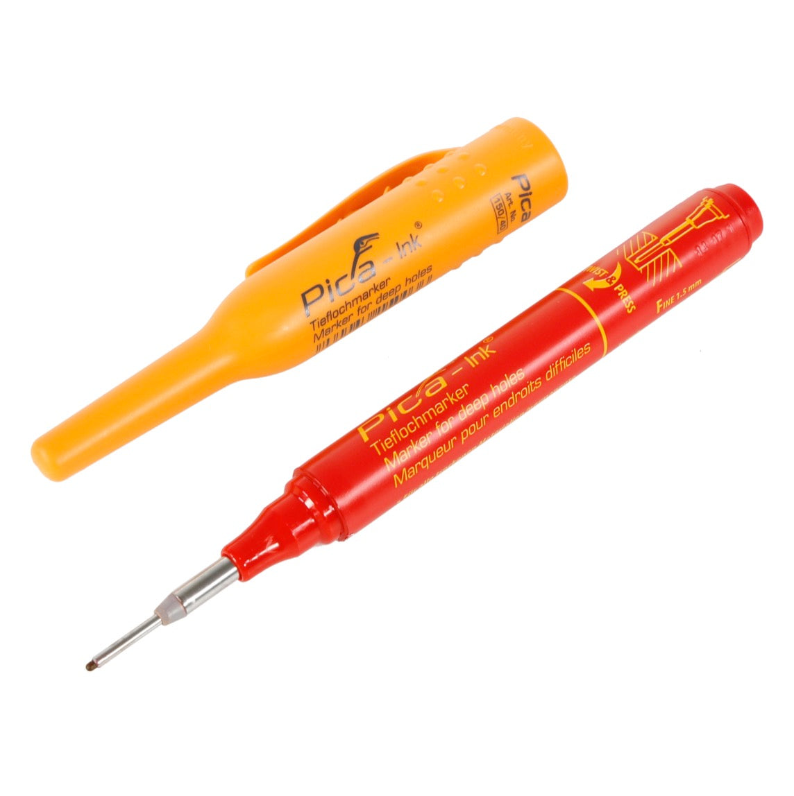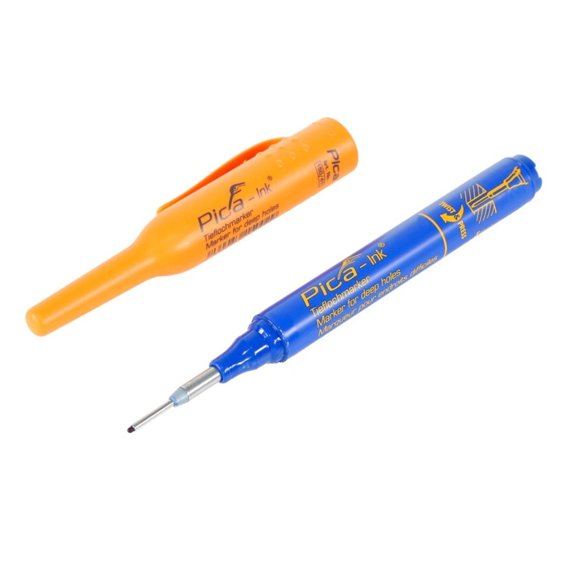 Die Pica INK Tieflochmarker in rot, blau und schwarz sind ideal geeignet für schwer zugängliche Stellen. Der Baumarker schreibt wasserfest auf fast allen trockenen Oberflächen. Der praktische Köcherschoner kommt mit Spezial-Clip für perfekte Ein-Hand-Bedienung daher. Die permanente Tinte auf Alkoholbasis ist von glatten Flächen sehr gut mit Alkohol/Spiritus entfernbar und trotzdem 24 Stunden offen lagerfähig. Die selbst nachstellende, patentierte Edelstahl-Teleskopspitze garantiert eine bis zu 3-fache Schreibleistung durch die volle Nutzung von 7 mm Abrieb-Länge der Faserspitze. Die Spitze kann mehrmals um 180° gedreht werden und sorgt somit für ein „zweites, drittes, ... Leben“. Hierfür muss lediglich die Teleskopspitze mit einer Zange zurückgeschoben werden, der Spitzen-Docht herausgezogen und um 180° gedreht, anschließend wieder eingeführt und die Teleskopspitze wieder vorgeschoben werden.