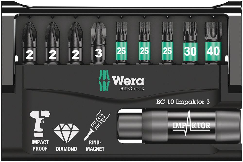 mit IMPAKTOR-Technologie für härteste Schraubbedingungen und Impakt-Schrauber-Maschinen · Bits diamantbeschichtet · Take it easy Tool Finder System Inhalt: 1 Bit-Halter IMPAKTOR mit Ringmagnet und Sprengring (75 mm lang) Bits für Schrauben mit Kreuzschlitz (PZD) 3 St. Gr. 2 / 1 St. Gr. 3** Bits für Schrauben mit Innen-TORX®-Profil 3 St. Gr. T 25 / 1 St. Gr. T 30 / 1 St. Gr. T 40** **= Bitlänge jeweils 25 mm