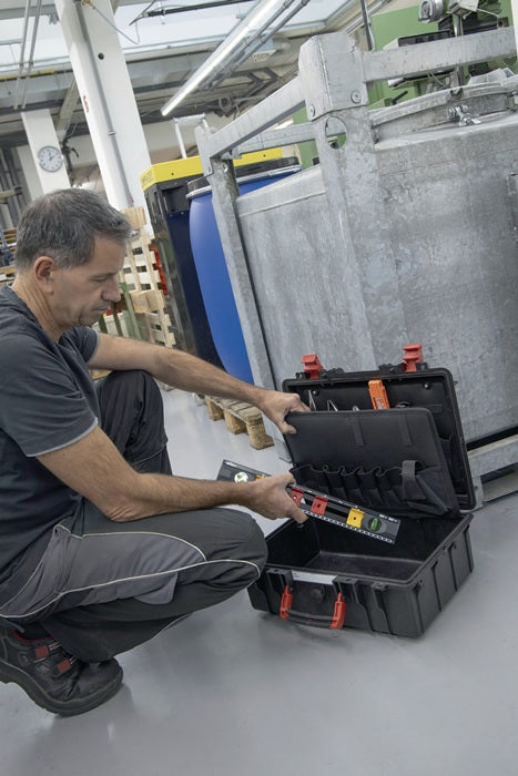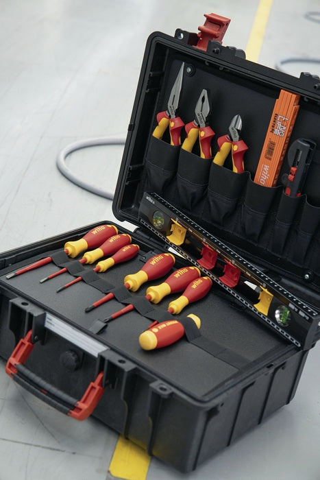 für die Elektroinstallation · optimale grundausstattung für den mobilen Einsatz · im robusten staub- und wasserdichten (IP67) Schutzkoffer mit Druckausgleichsventil · Möglichkeit der induviduellen Markierung durch Namensschild Inhalt: 1 Flachrundzange 200 mm mit 2-Komponenten-Griff* 1 Seitenschneider 160 mm mit 2-Komponenten-Griff* 1 Kombizange 180 mm mit 2-Komponenten-Griff* 1 Elektriker Wasserwaage 400 mm (zum horizontalen und vertikalen Messen und Markieren der Abstände von Unterputzdosen) je 1 Schraubendreher mit SoftFinish®-Griff (slimFix) für Schlitzschrauben Gr. 3,5 / 4,0 / 5,5 mm* je Schraubendreher mit SoftFinish®-Griff (slimFix) für Schrauben mit Kreuzschlitz (PH) Gr. 1 / 2* 1 Schraubendreher mit SoftFinish®-Griff (slimFix) für Schrauben mit Plus-Minus-Profil (Schlitz/PZD) Gr. 2 x 100 mm* 1 Elektriker-Gliedermaßstab Longlife® 2 Meter 1 Abisolier-Multitool für Rundkabel 8 - 13 mm 1 Schraubendreher mit Bitmagazin (inkl. 4 Slim-Bits (Schlitz / PH / PlusMinus Sl-PZD Gr. 2**) *VDE isoliert ** 75 mm lang