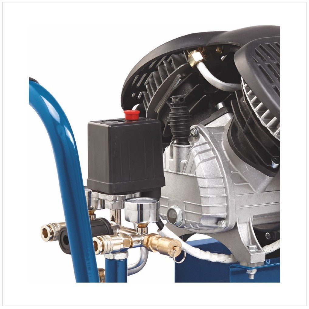 Der HC 53 Kompressor von Scheppach überzeugt durch seine sehr hohe Leistungsfähigkeit bei verhältnismäßig Kompakter und transportabler Bauweise. Der HC 53 arbeitet mit einem Druck von 10 Bar und einer sehr hohen Ansaugleistung von 412 Litern. Der Doppelzylinder-Kompressor Motor sorgt für ein schnelles Befüllen des Lufttanks und bringt es auf 2.850 Umdrehungen pro Minute. Des Weiteren ist der HC 53 mit einem Manometer und einem Druckminderer ausgestattet, wodurch der Druck des Kompressors optimal geregelt werden kann. Zwei große Räder am Kompressor sorgen für einen leichten Transport.