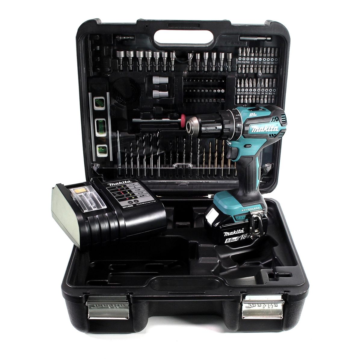 Makita DHP 485 STTK Akku Schlagbohrschrauber 18 V 50 Nm Brushless + 1x Akku 5,0 Ah + Ladegerät + 101 tlg. Zubehörset + Koffer