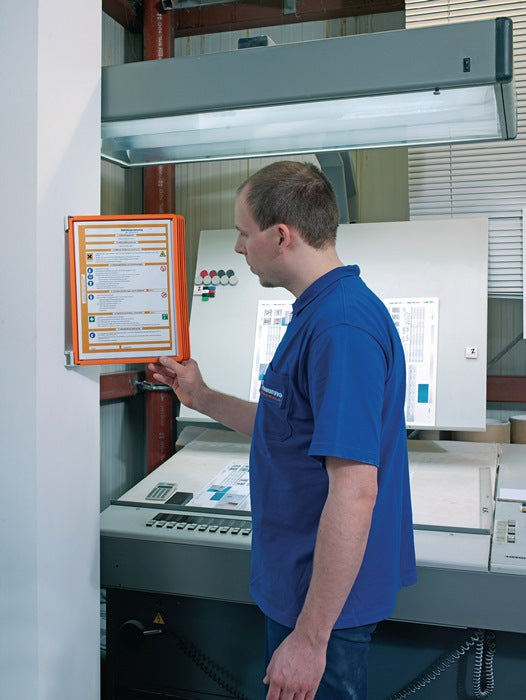 Komplett-Set · mit Profilrahmen · Metall-Wandhalter mit 5 Sichttafeln · Ausführung zur Aufnahme von Brandschutzverordnungen - rot, Betriebsanweisungen für Maschinen - dunkelblau oder Betriebsanweisungen gem. Gef.SToffV - orange