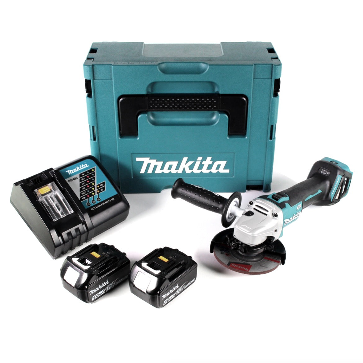 Makita DGA 511 RTJ cordless angle grinder 18 V 125 mm brushless + 2x rechargeable battery 5.0 Ah + charger + Makpac