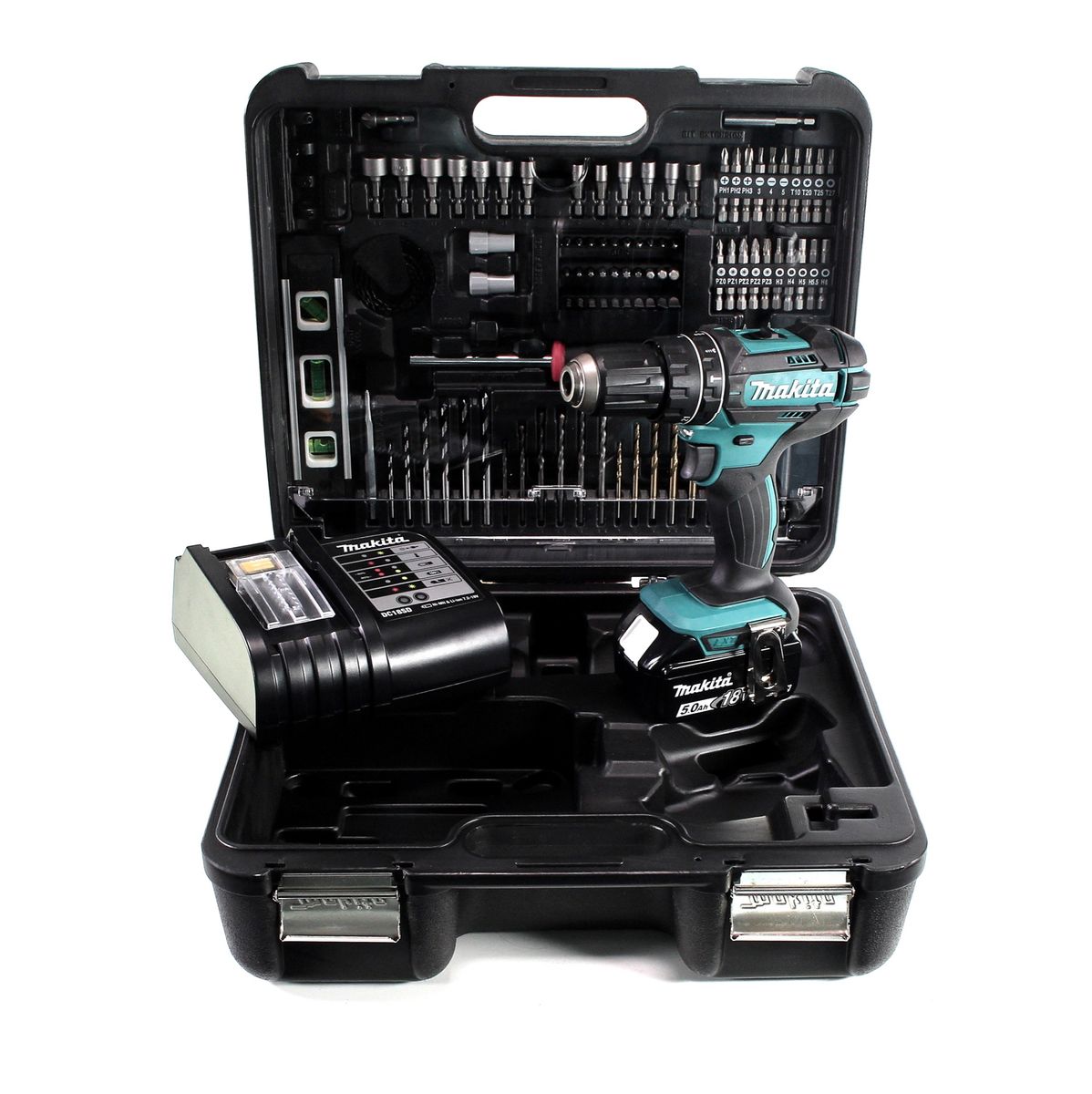Makita DHP 482 STTK Akku Schlagbohrschrauber 18 V 62 Nm + 1x Akku 5,0 Ah + Ladegerät + 101 tlg. Zubehörset + Koffer
