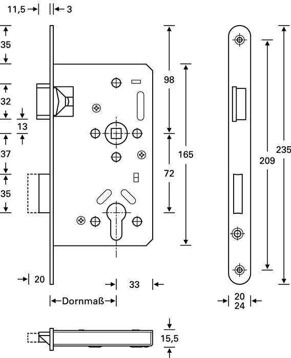 Panic change function E - for single-leaf timber or steel doors - fire protection suitability to DIN 18250 class 3 and DIN EN 179 - PZW design - 2-turn - latch made of steel with malleable cast iron head, nickel-plated - bolt made of nickel-plated steel - distance 72 mm - square 9 mm - faceplate length 235 mm made of stainless steel, rounded - lock case closed on all sides - cannot be combined with knob, free swing and electronic cylinders