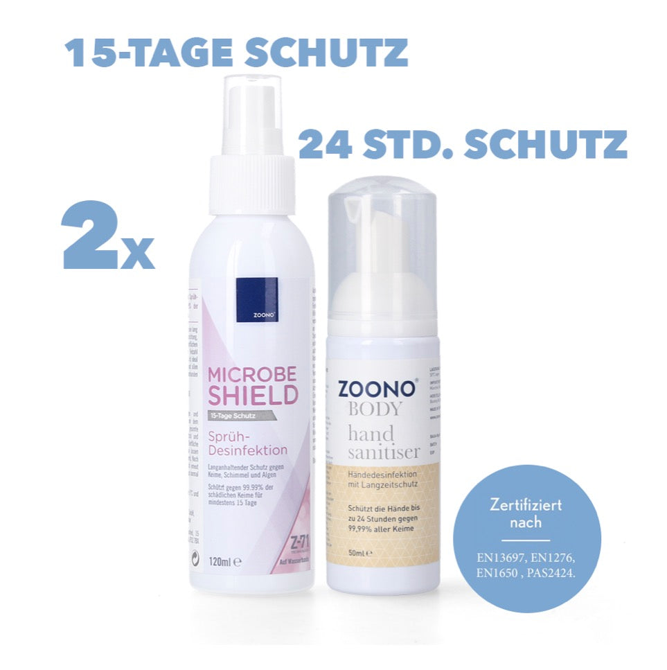 Zoono Desinfektions Set 2x Z-71 Micobe Shield Flächendesinfektionsmittel 120 ml + 2x Handdesinfektion 50 ml ( Zertifiziert nach PAS 2424 / EN13697 / EN1276 / EN1650 )