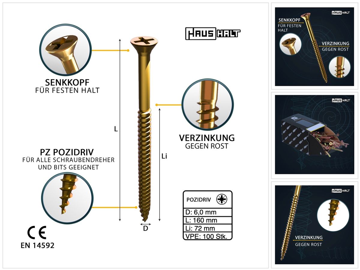 - 100x HausHalt Tornillos universales para madera 6,0 x 160 mm PZ3 (000051371220)
