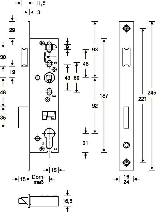 Caja de cerradura de acero cerrada por arriba y por abajo - orificio de encaje continuo por encima del seguidor de la cerradura - casquillos de protección contra virutas - de un solo efecto con pestillo robusto - escotadura del pestillo 15 mm - utilizable DIN izquierda y derecha - dirección de tope modificable - preparado para cilindro de perfil, con inversión - distancia 92 mm - seguidor de apriete 8 mm - pestillo y pestillo niquelados - antepecho en el centro - longitud del antepecho 245 mm - inclinado - retroceso 15 mm - llave de clasificación según EN 12 209 disponible
