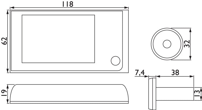 Pantalla a color de 3,5″ - cámara de 1,0 megapíxeles - dimensiones externas: 119 x 63 x 19 mm - instalación rápida y sencilla para taladro de puerta estándar de 14-28 mm - no se requieren taladros adicionales en la puerta - instalación y extracción posteriores posibles en cualquier momento - tras la activación de la pantalla, se apaga de nuevo automáticamente transcurridos 15 segundos - apto para grosores de puerta de 38-116 mm - temperatura de funcionamiento de -10° a +50° Celsius - ángulo de visión de 120° - 4 pilas AAA (no incluidas).