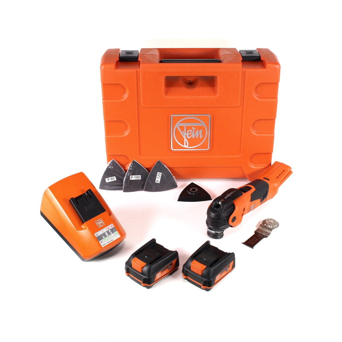 FEIN AFMT 12 QSL C Machine Oscillante sans fil MultiTalent 12 V + Accessoires de base pour ponçage et sciage + Coffret de transport + 2 x Batteries 2,5 Ah + Chargeur ALG 50