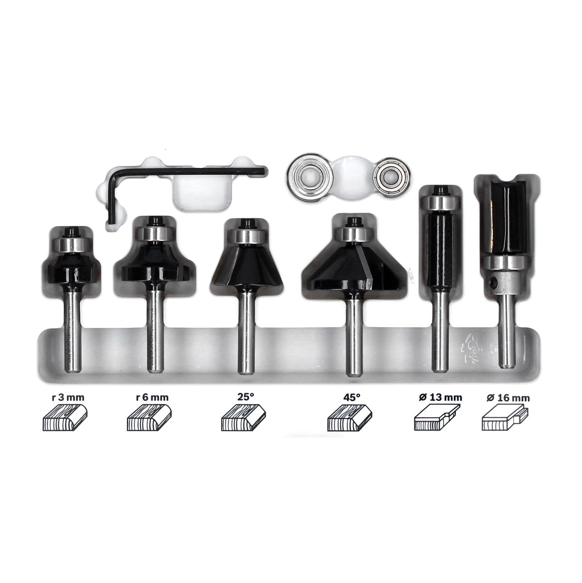 - 1x Jeu de fraises à chants et chants Bosch 6 pièces, queue de 6 mm (2607017468) comprenant :