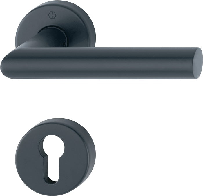 con chiave per porte interne - collaudata secondo DIN EN 1906: 37-0140A, montaggio per conto terzi - F9714M nero opaco, quadro: 8 mm, con manicotto di spinta/riduzione da 8/8,5 mm - TS = 37 - 42 mm Cuscinetto: Maniglie della porta libere, molle di ritorno utilizzabili a destra/sinistra, cuscinetti a strisciamento esenti da manutenzione Collegamento: Perno rapido HOPPE con perno pieno HOPPE (parte perno/foro) Sottostruttura: Plastica, camme di supporto Fissaggio: Viti nascoste, continue, alternate, multiuso