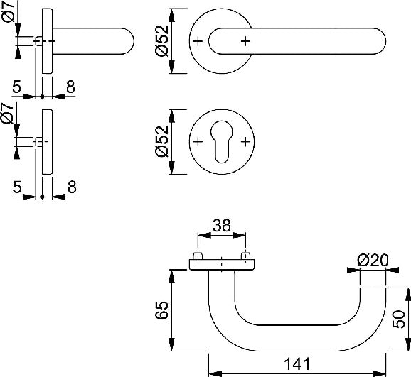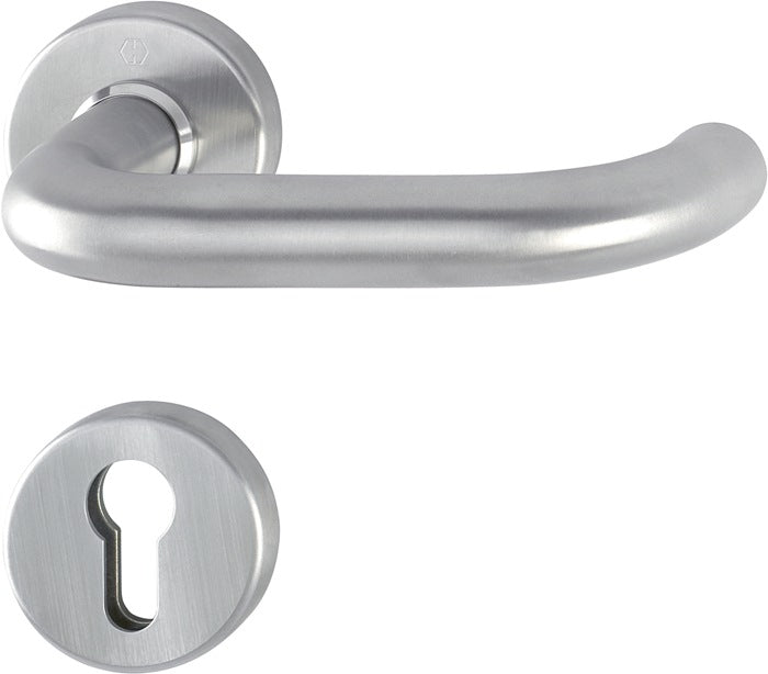 per protezione combinata - Maniglia a rosetta in acciaio inox con rosetta a chiave per porte esterne/residenziali (interne) - Cuscinetto: maniglia allentata, cuscinetto a strisciamento esente da manutenzione - Attacco: perno rapido con perno pieno (da ordinare separatamente) - Sottostruttura: acciaio, camme di supporto - Fissaggio: nascosto, continuo, per viti filettate M5 - Particolarità: combinabile con la piastra posteriore per pomolo ES1 (SK2) per protezione combinata - DIN sinistra/destra