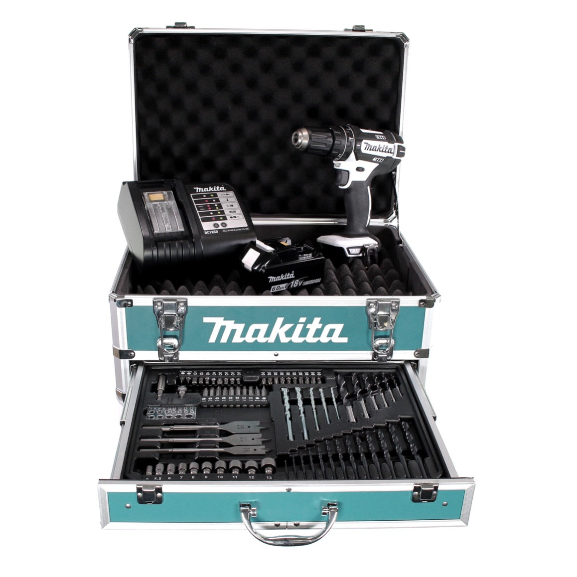 Makita DHP 482 W SGX4 Akku Schlagbohrschrauber 18V 62Nm + 1x Akku 6,0Ah + Ladegerät + 70tlg. Bit Bohrer Set + Koffer