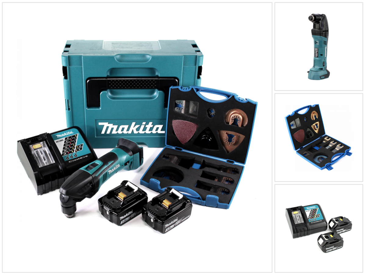 Makita DTM 50 RFJ Utensile multifunzione a batteria 18V in valigetta Makpac + 2x Batterie BL 1830 3,0 Ah + Caricatore rapido DC 18 RC + Set di lame WellCut MT-20