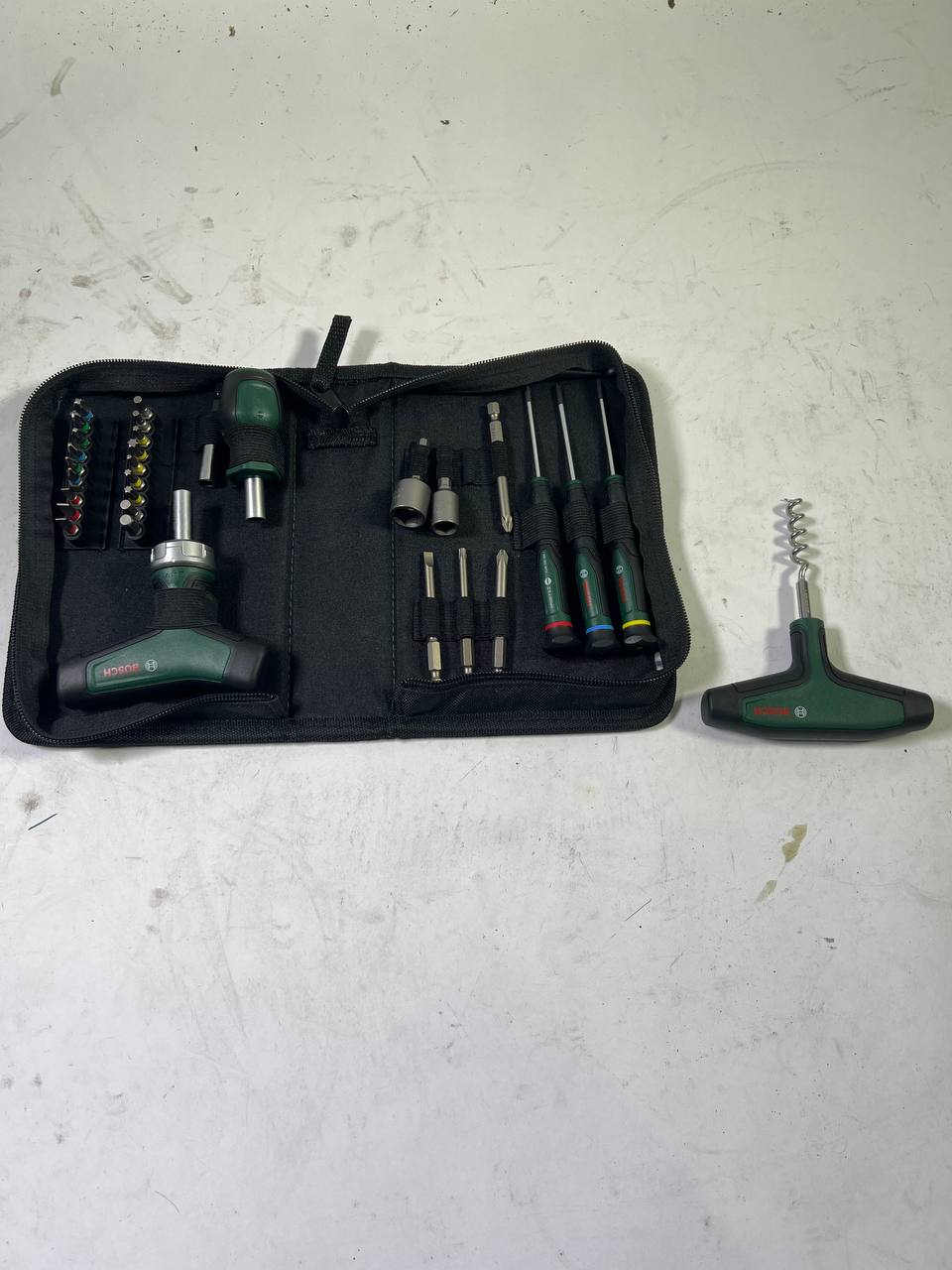 Kalendarz adwentowy narzędzi ręcznych Bosch 2024 z 33-częściowym zestawem narzędzi ( 1600A0349X ) Wkrętak z grzechotką do końcówek z uchwytem T, wkrętak precyzyjny, wkrętak do końcówek Stubby, akcesoria, korkociąg, torba