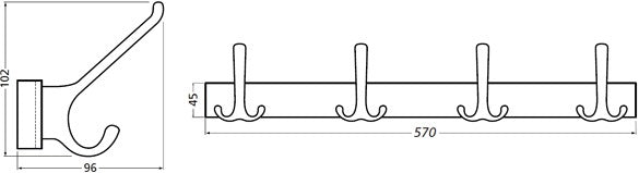 Leichtmetallhaken · silberfarbig eloxiert · montiert auf Profilleiste · 2 verdeckte Befestigungsaufnahmen auf der Rückseite (Lieferung ohne Schrauben oder Dübel !) · Ausladung 96 mm · Höhe 102 mm