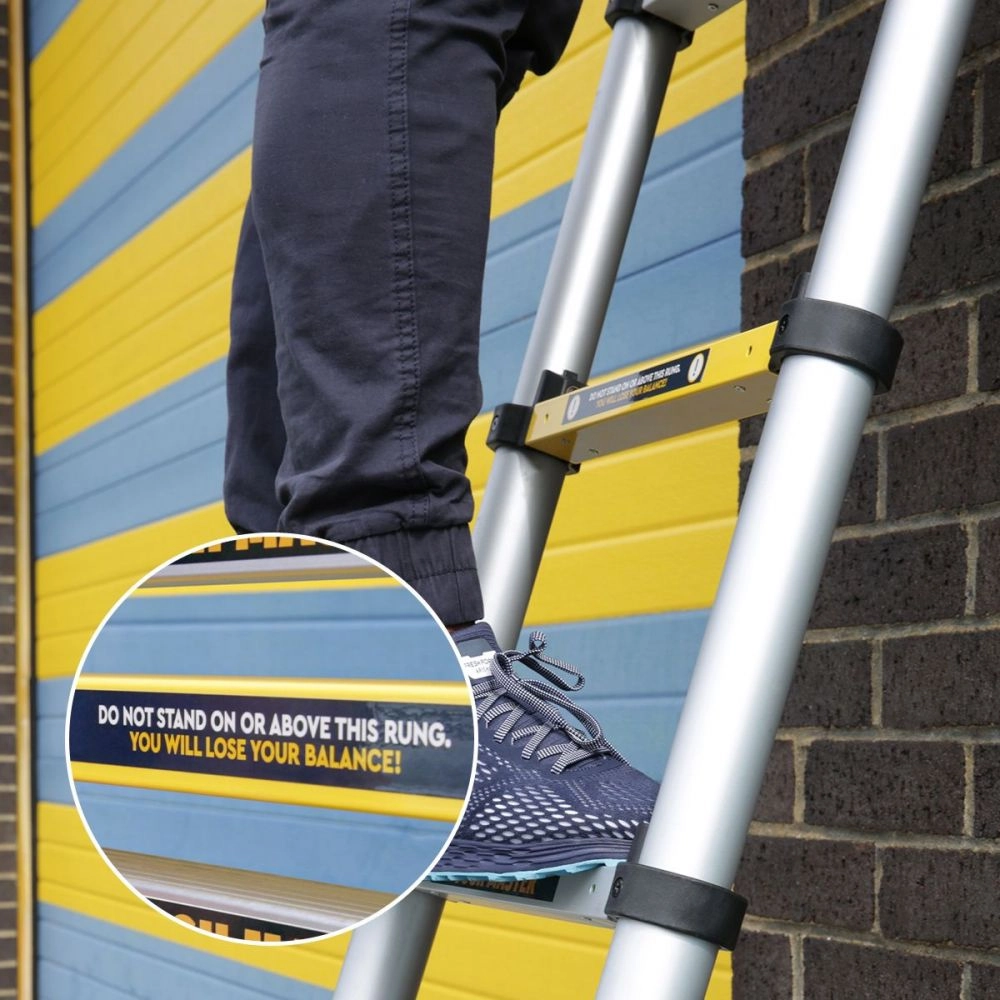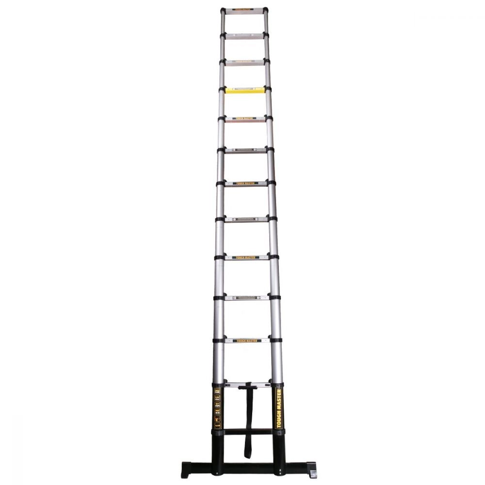 Die TOUGH MASTER Teleskopleiter ML-1004A ist in Bezug auf Benutzerfreundlichkeit, Haltbarkeit und ihrer beeindruckender Größe kaum zu übertreffen. Dank der 1,3 mm dicken Aluminiumprofile kann die Leiter eine maximale Belastung von 150 kg tragen. Darüber hinaus erreicht die Leiter im voll ausgezogenen Zustand eine maximale Höhe von 3,8 m, was höher ist als die meisten ausziehbaren Leitern. Zur sicheren Verwendung wurde die Leiter mit einigen Sicherheitsfunktionen ausgestattet. Damit Sie die maximale Kletterhöhe direkt erkennen können, ist die Leiter mit hellgelben Markierungen versehen worden. Für eine stabile Verwendung sorgt die in der Basis der Leiter positionierte Stabilisierungsstange, während die integrierten rutschfesten Gummifüße für noch mehr Halt sorgen, vor allem wenn Sie die Leiter angewinkelt nutzen. Des Weiteren sorgt der starke, sichere Verriegelungsmechanismus für Sicherheit während des Gebrauchs. Damit Sie Ihre Finger nicht einklemmen, während Sie die Leiter zusammenfahren, sind die Leitersprossen 2,5 cm voneinander entfernt. Diese Leiter wird Sie bei Ihren anstehenden Arbeiten sicher nicht im Stich lassen. Sie lässt sich einfach schließen und durch Ihre kompakte Größe leicht tragen und aufbewahren. Zu den weiteren Eigenschaften zählt der praktische Knopfverschluss, mit welchen Sie durch den Druck auf 2 Knöpfen die Leiter auf eine kompakte Länge von 118 cm kinderleicht zusammenklappen lassen können. Dazu kommt, dass die Leiter durch ihr geringes Gewicht von 15,87 kg einfach transportiert werden kann und der mitgelieferter Gurt die Leiter zusammenhält.
