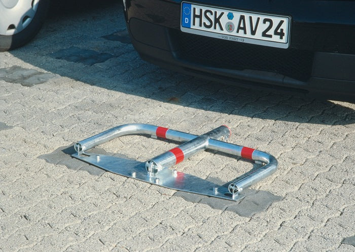 Stahl, feuerverzinkt · kippbar und abschließbar mit Profilzylinder, mit 3 Schlüsseln, verschiedenschließend · Bodenplatte zum Aufschrauben (ohne Befestigungsmaterial) · Signalwirkung durch Reflexfolie