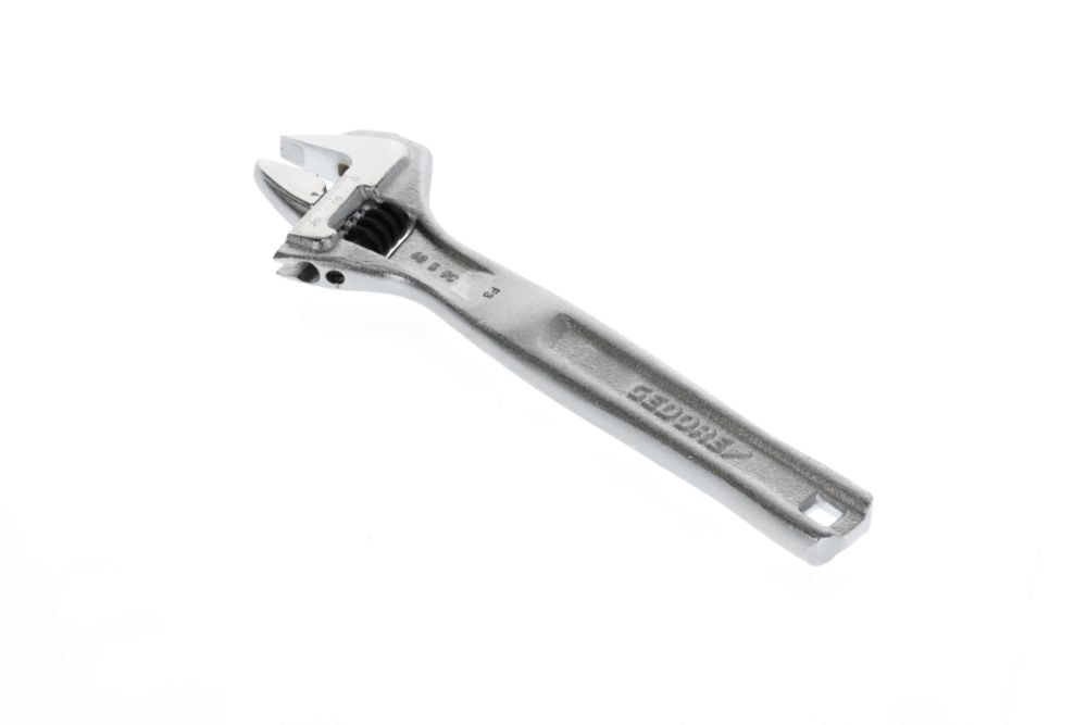 verstellbar · CV-Stahl · verchromt · Kopf geschliffen · schwedisches Modell · Rolle mit Linksgang · Maulstellung 15° · mit Einstell-/Messskala auf dem Schlüsselkopf · eine geschützte Mechanik und eine zusätzliche Schlagfläche ermöglichen leichte Schläge ohne die Funktion des Schlüssels zu beeinträchtigen ISO 6787