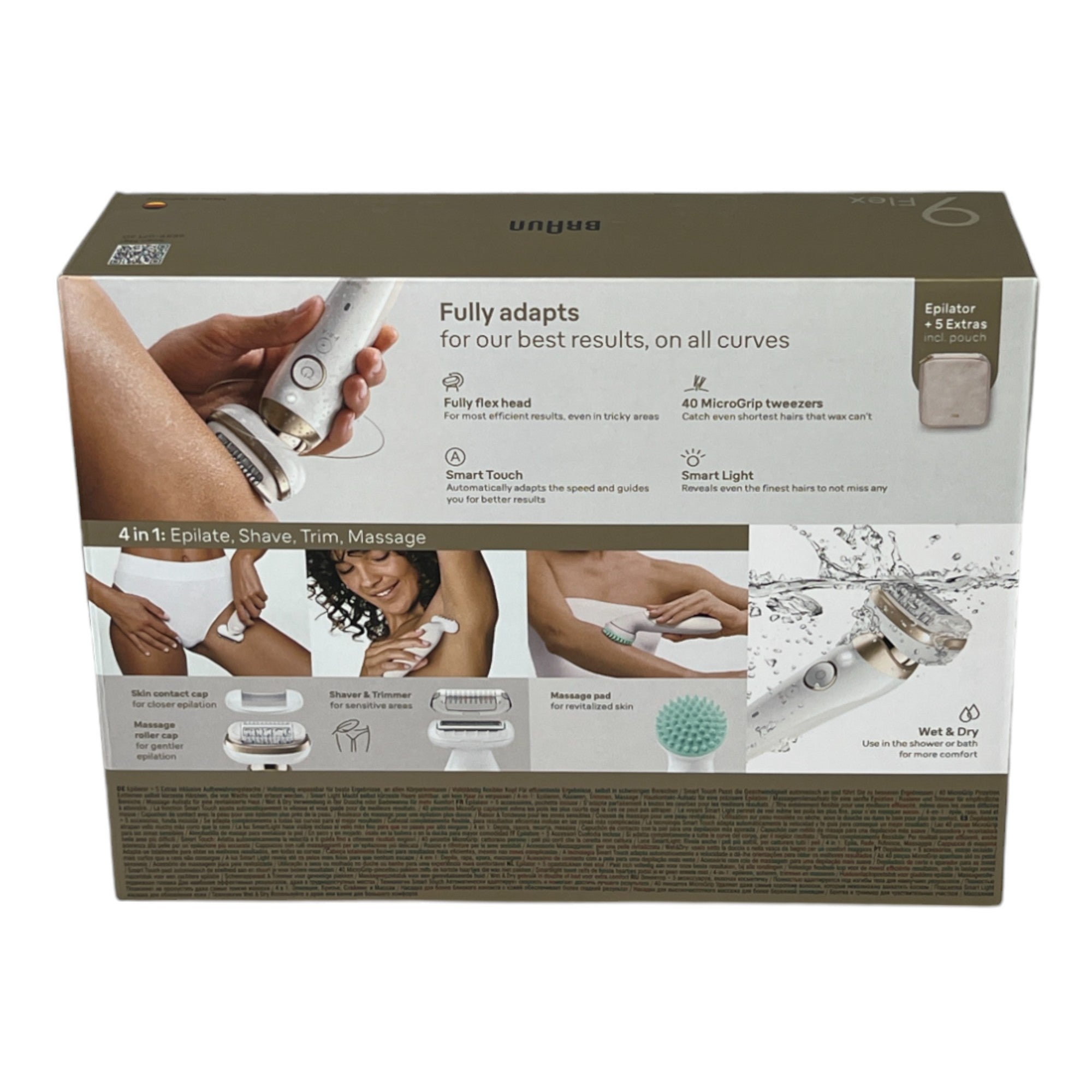 Der Braun Silk-épil 9 Flex 9-071 Epilierer bietet dank seines 360° Flex-Kopfs eine präzise und gründliche Haarentfernung auch an schwer zugänglichen Stellen. Die 40 MicroGrip Pinzetten entfernen selbst feinste Haare ab 0,5 mm Länge direkt an der Wurzel für eine bis zu vier Wochen anhaltende, seidig-glatte Haut. Die intelligente Andruckkontrolle und Geschwindigkeitsanpassung durch die SmartTouch-Funktion gewährleisten schnelle und makellose Ergebnisse. Der wasserdichte Epilierer kann auch in der Dusche oder Badewanne für ein komfortables und schmerzreduziertes Erlebnis verwendet werden. Der 3-in-1 Braun Epilierer vereint einen Epilierer, Rasierer und ein Massagepad in einem Gerät. Dank verschiedener Aufsätze ermöglicht er nicht nur langanhaltende Haarentfernung, sondern auch eine schnelle Rasur und dient gleichzeitig als Massagegerät zur Hautpflege. Dieses in Deutschland hergestellte Produkt steht für zuverlässige Markenqualität und bietet bei Online-Registrierung eine Garantie von bis zu fünf Jahren. Erleben Sie mit dem Braun Silk-épil 9 Flex anpassungsfähige und effektive Körperpflege.